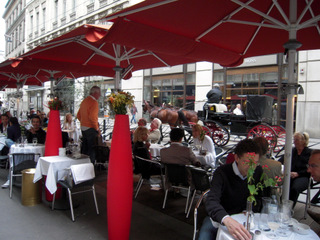 レストランは予約なしでは昼食、夕食ともほとんど無理と言われるほどの人気。 歩道のカフェもご覧の通りで、観光客が席を見つけるのはほとんど無理のようです。 サンドイッチ売場も地元の人たちが、入れ替わり立ち替りやってきて、急ぐ人は立ったまま小さな「アクテル」(125cc)と呼ばれるカップで ビールやワインを飲みながら食べています。 昔ベートーベンも立ち寄ったと言われるこの店のおいしい人気のサンドイッチは、あっという間にプレートが空になります。 |
